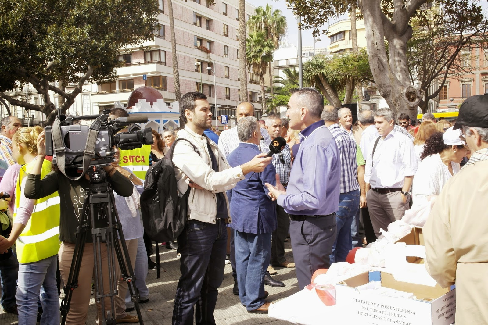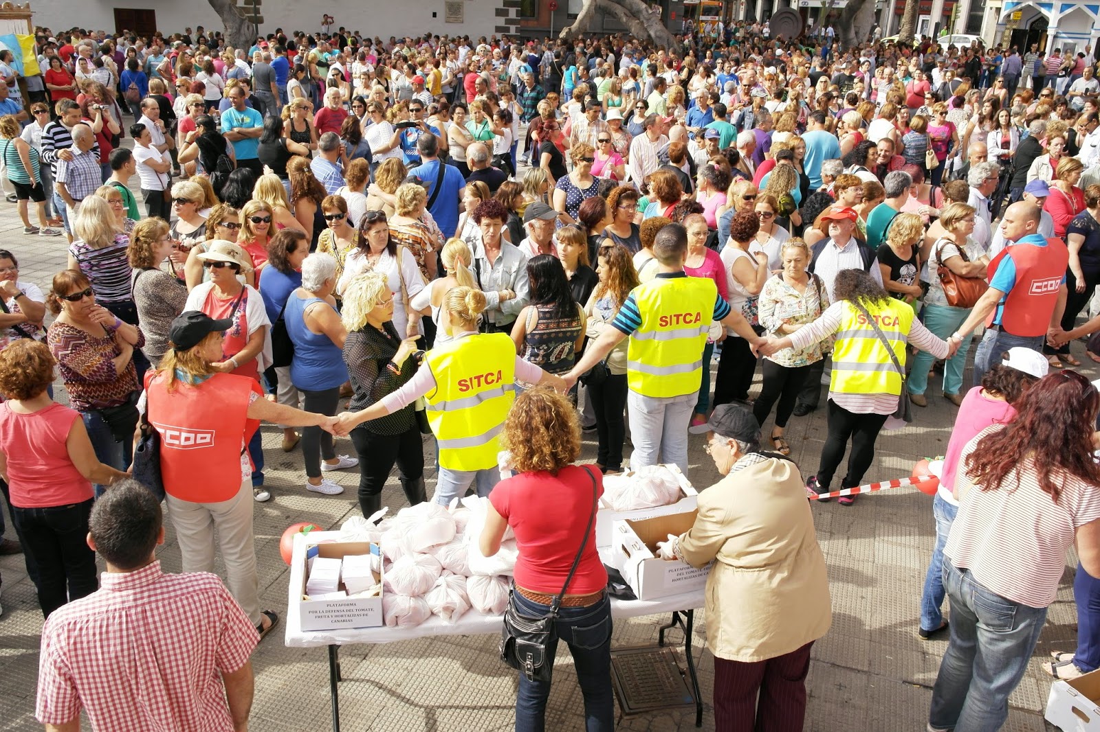 La PLATAFORMA POR LA DEFENSA DEL TOMATE, FRUTAS Y HORTALIZAS DE CANARIAS, formada por las patronales del sector de ambas provincias, FEDEX y ACETO, las organizaciones agrarias COAG y ASAJA y los sindicatos SITCA, STU, Coordinadora de Aparcería Intersindical Canaria y CC.OO, iniciamos con esta Concentración una serie de movilizaciones para SALVAR EL SECTOR DEL TOMATE Y HORTALIZAS.